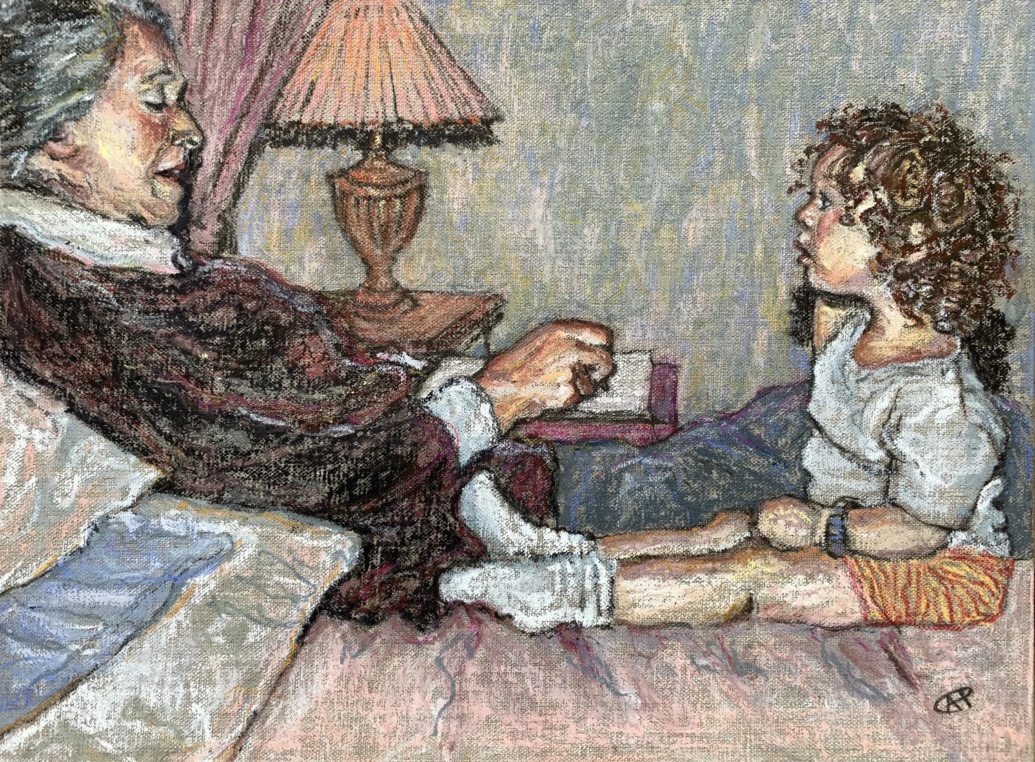 Oil pastel on canvas board 40 x 30cm  This commission was a client’s mother who used to draw little pictures as she told her granddaughter stories.  I love the intensity of the child’s gaze and the relationship captured between the two - you can tel